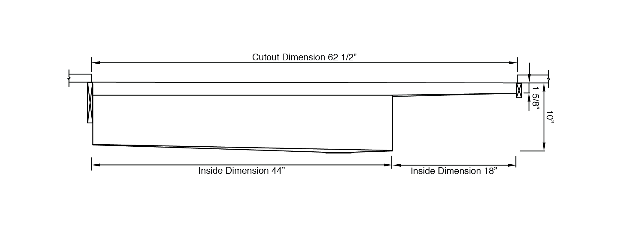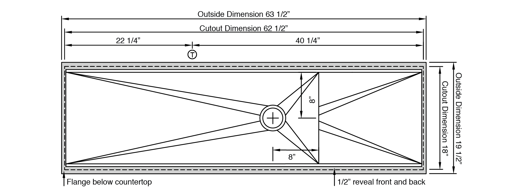 - Countertop cutout: 62 1/2” x 18”