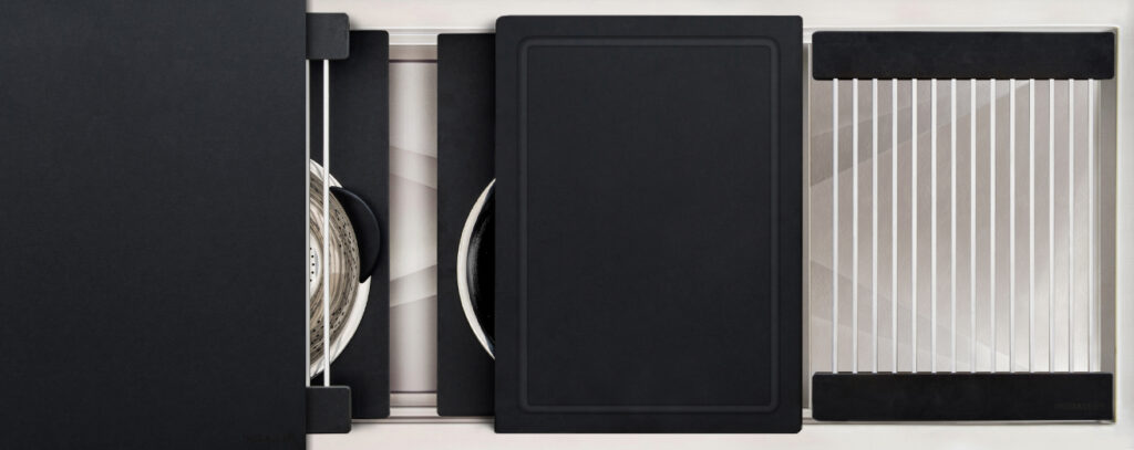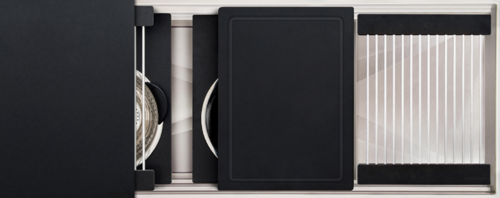Our matte black Graphite Wood Composite material perfectly complements a contemporary, transitional, or traditional kitchen design and looks wonderful with a wide range of cabinet and countertop colors. This high-performance, dense material is only ½ inch thick, is gentle on your knives, and is easy to clean in the Workstation or in the dishwasher.