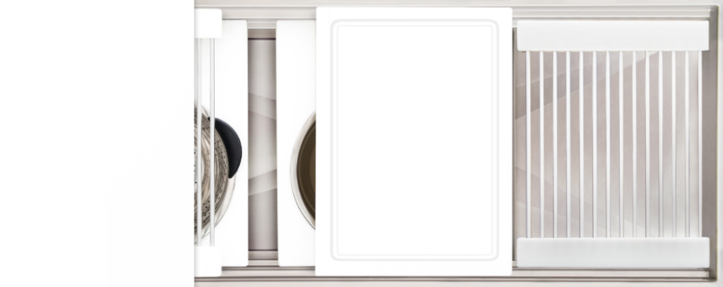 A modular cover system and third-tier workspace available in all four finishes. The sections slide apart for easy removal and each one can be used individually on the countertop tier. Use as a complete set to cover the Workstation or individually as work surfaces.
