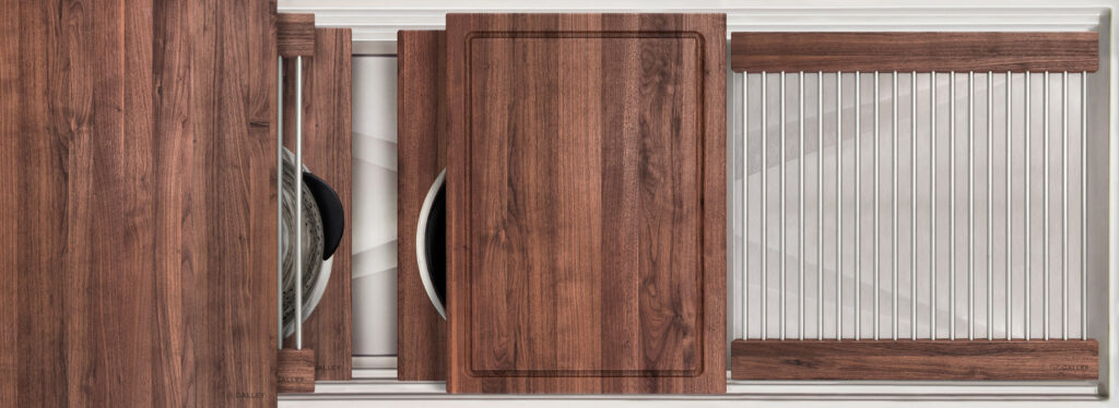 Our matte black Graphite Wood Composite material perfectly complements a contemporary, transitional, or traditional kitchen design and looks wonderful with a wide range of cabinet and countertop colors. This high-performance, dense material is only ½ inch thick, is gentle on your knives, and is easy to clean in the Workstation or in the dishwasher.