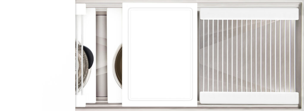 A modular cover system and third-tier workspace available in all four finishes. The sections slide apart for easy removal and each one can be used individually on the countertop tier. Use as a complete set to cover the Workstation or individually as work surfaces.
