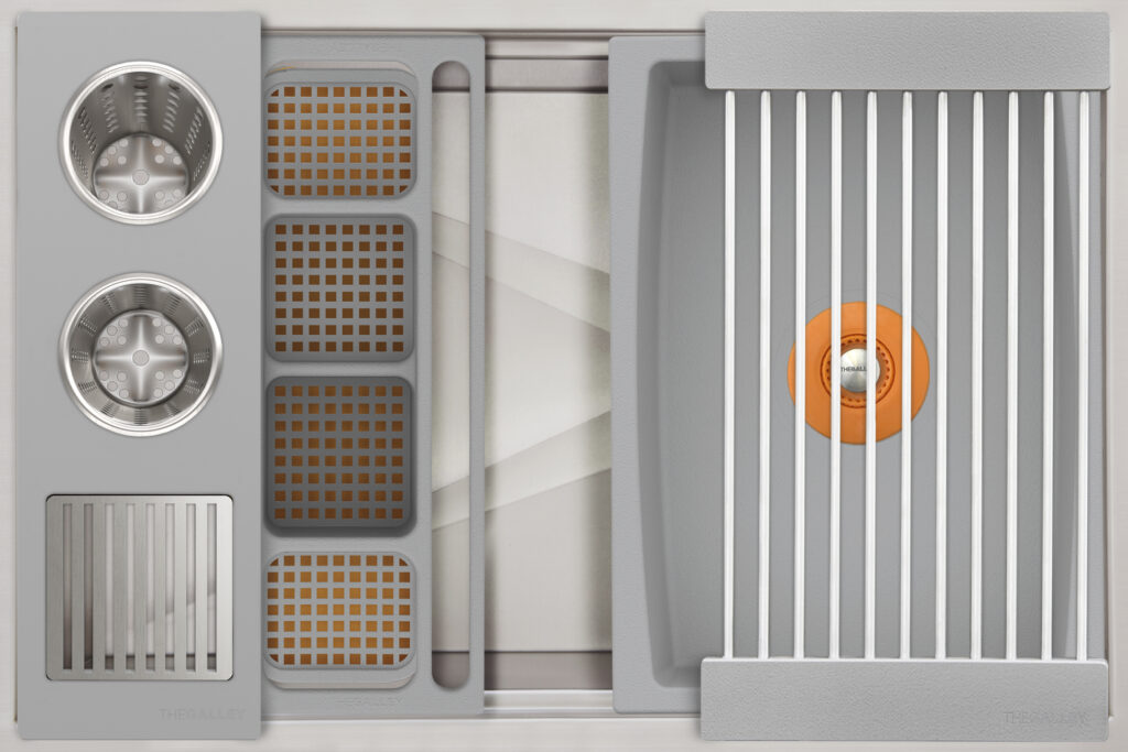 A modular cover system and third-tier workspace available in all four finishes. The sections slide apart for easy removal and each one can be used individually on the countertop tier. Use as a complete set to cover the Workstation or individually as work surfaces.