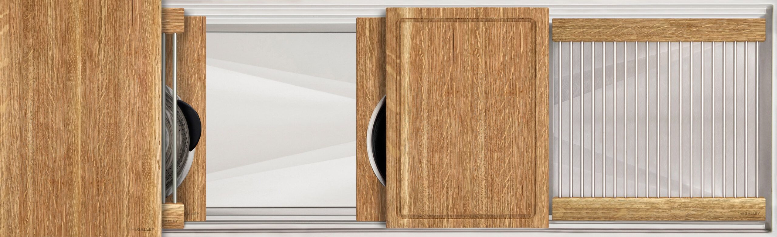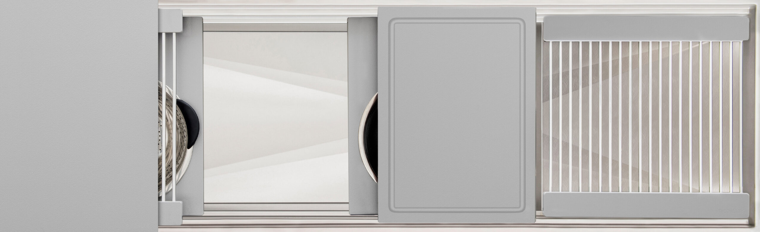 A modular cover system and third-tier workspace available in all four finishes. The sections slide apart for easy removal and each one can be used individually on the countertop tier. Use as a complete set to cover the Workstation or individually as work surfaces.