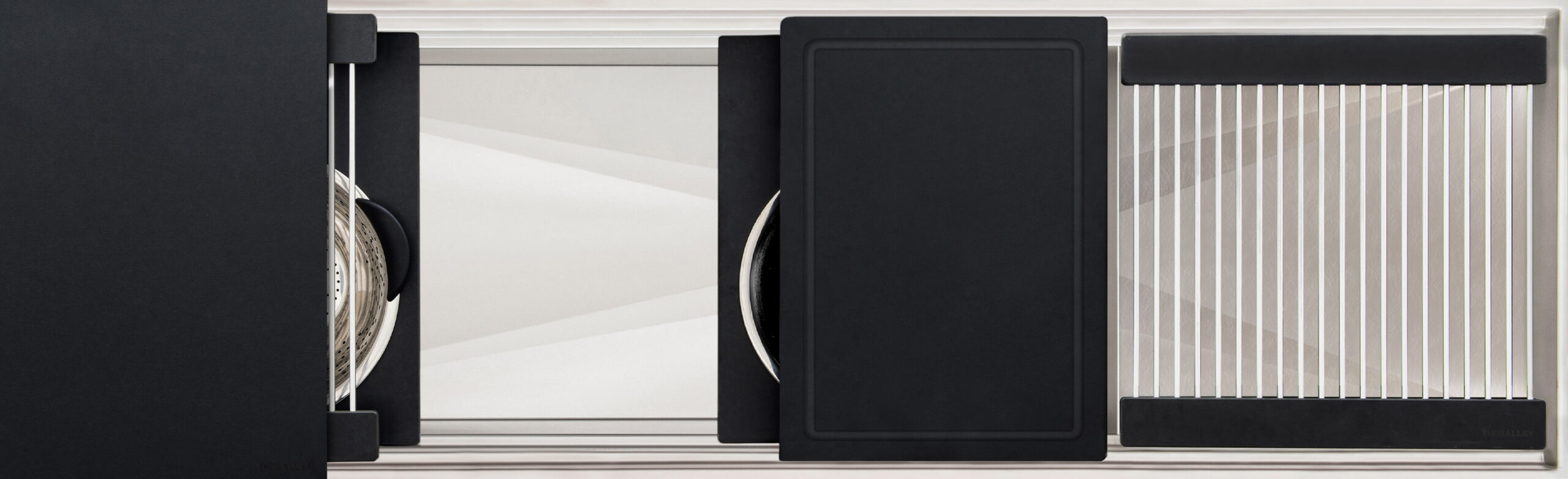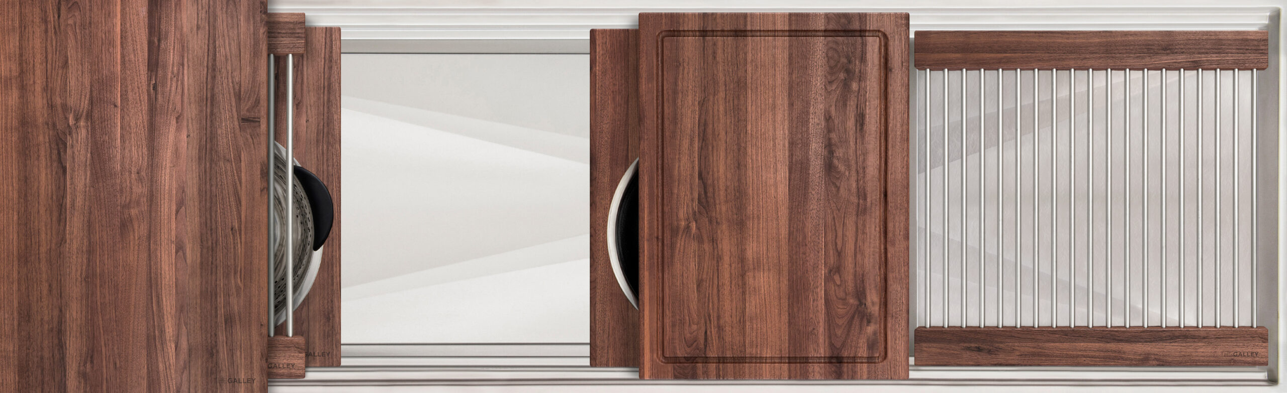 Our matte black Graphite Wood Composite material perfectly complements a contemporary, transitional, or traditional kitchen design and looks wonderful with a wide range of cabinet and countertop colors. This high-performance, dense material is only ½ inch thick, is gentle on your knives, and is easy to clean in the Workstation or in the dishwasher.