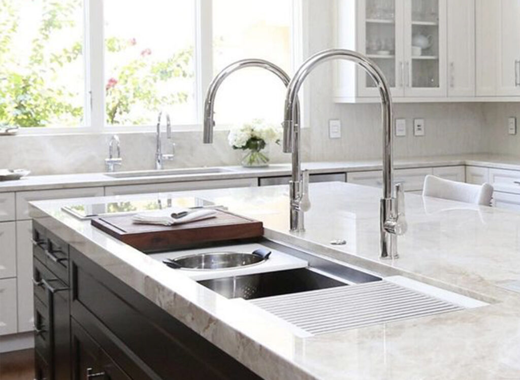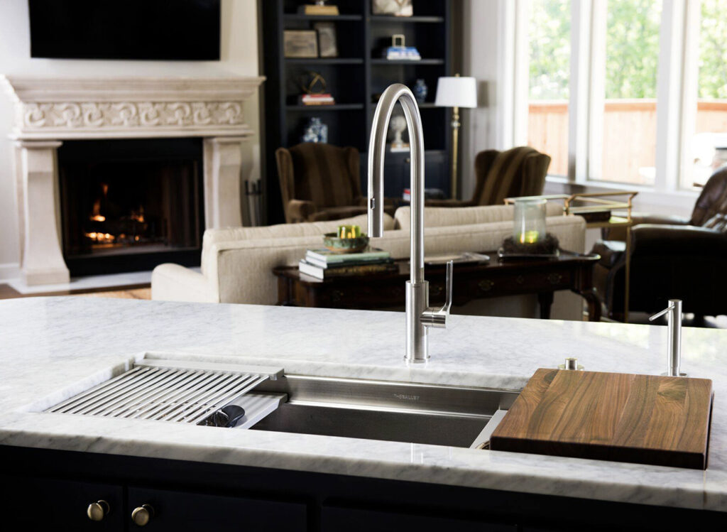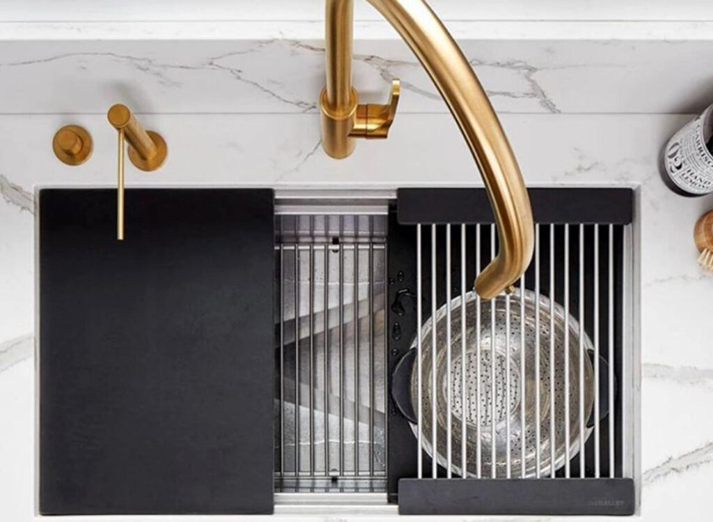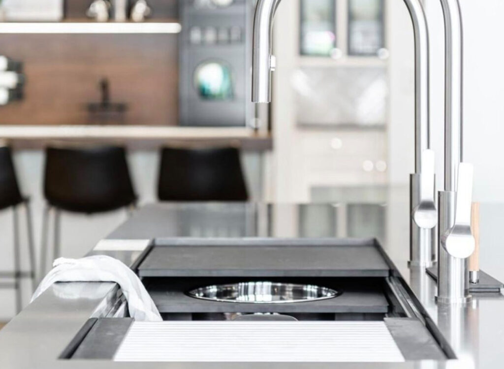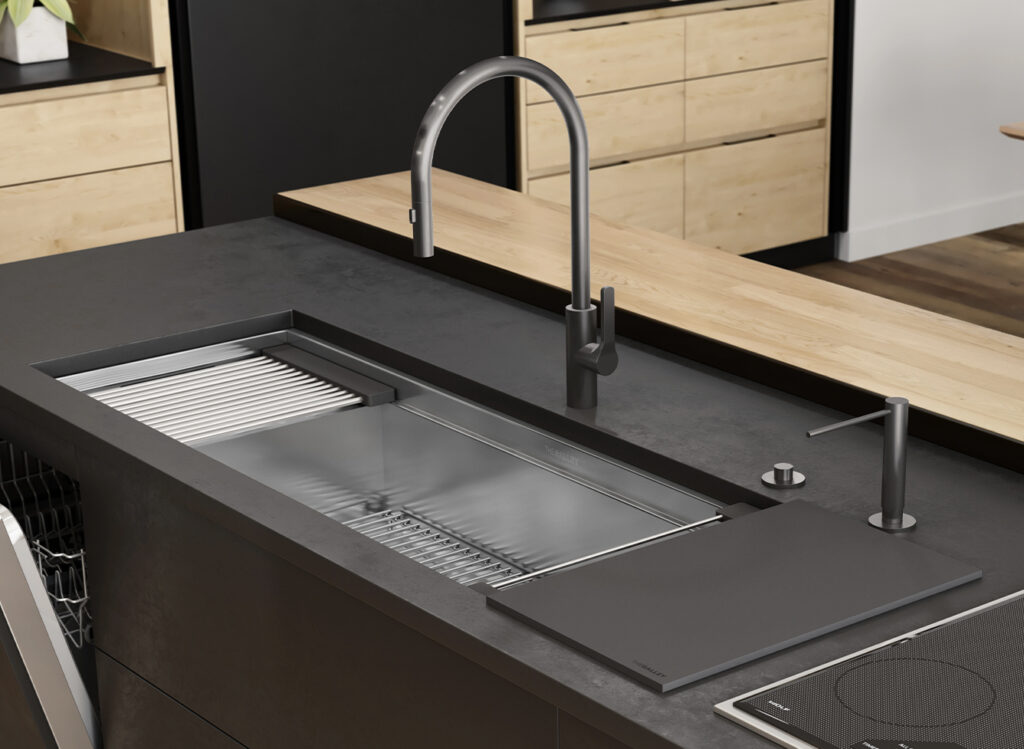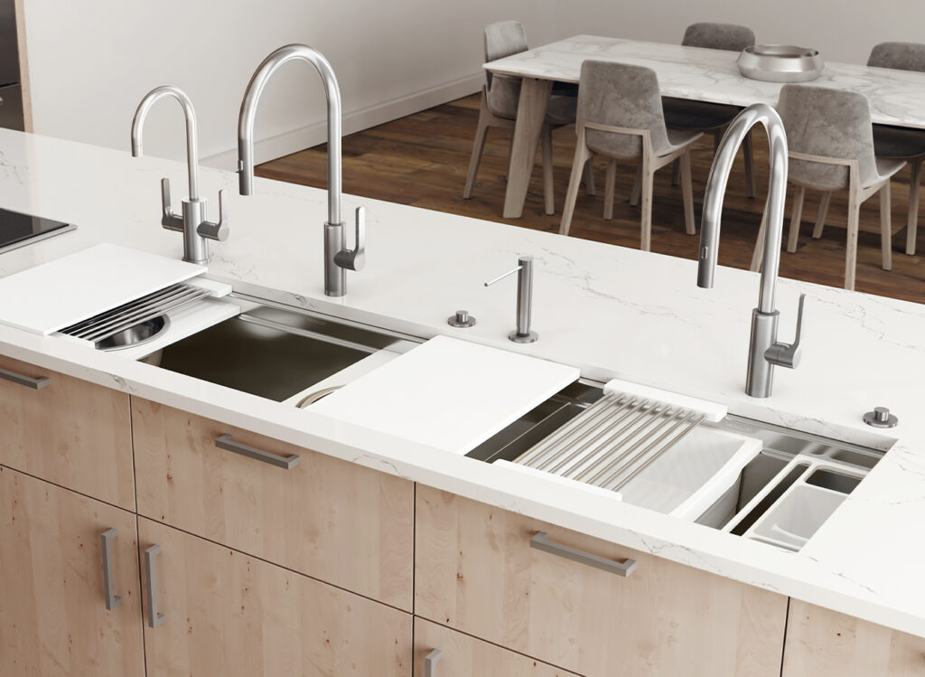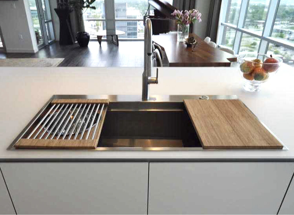 Expand the functionality of your Galley without sacrificing under-counter storage or appliances by adding an 18 or 12-inch built-in DryDock®️ to either or both sides of any Workstation. Highly engineered for function, it expands the useful space in the basin by allowing you to dock your Culinary Tools to the side when you need more space.