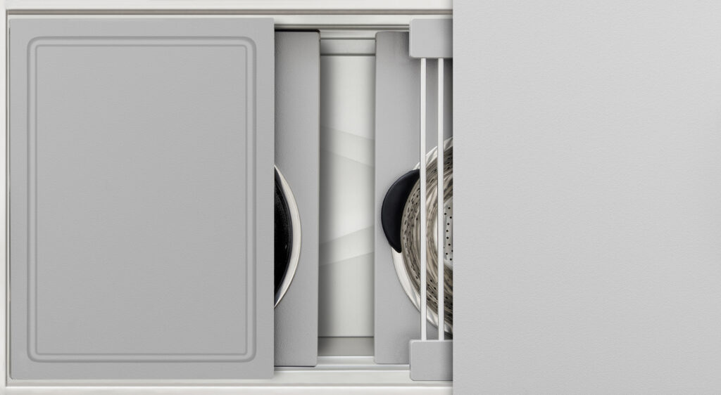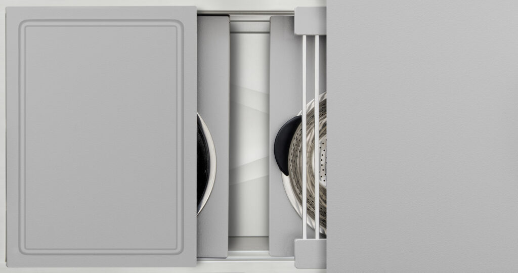 A modular cover system and third-tier workspace available in all four finishes. The sections slide apart for easy removal and each one can be used individually on the countertop tier. Use as a complete set to cover the Workstation or individually as work surfaces.
