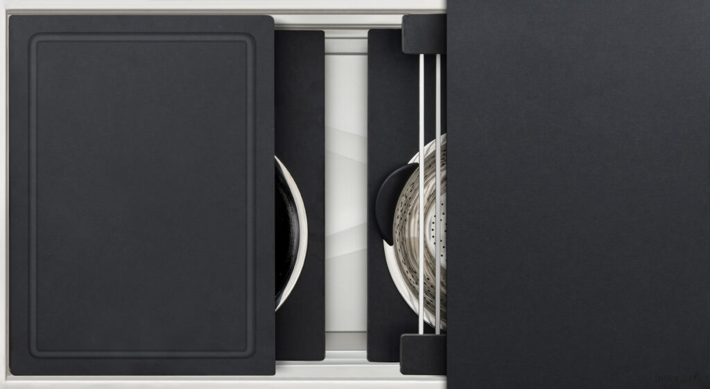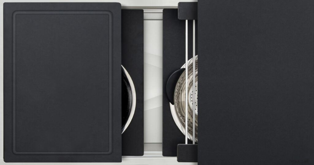 Our matte black Graphite Wood Composite material perfectly complements a contemporary, transitional, or traditional kitchen design and looks wonderful with a wide range of cabinet and countertop colors. This high-performance, dense material is only ½ inch thick, is gentle on your knives, and is easy to clean in the Workstation or in the dishwasher.