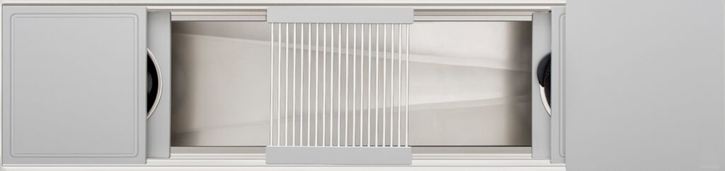 A modular cover system and third-tier workspace available in all four finishes. The sections slide apart for easy removal and each one can be used individually on the countertop tier. Use as a complete set to cover the Workstation or individually as work surfaces.